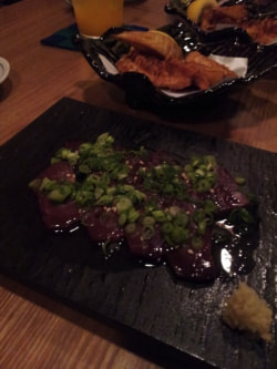 タケノコの唐揚げと馬刺。 馬刺は全然臭みがない〜!