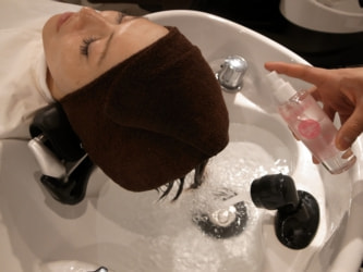 STEP5 頭皮&肩マッサージ・・・タオルドライ後、頭皮の美容液をつけ揉みこみ保湿と潤いを与えていきます。