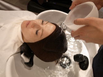 STEP4 100%アルガンオイル温浴マッサージ・・・ホートターバンをした後、温かいお湯に100%アルガンオイル混ぜ合わせものを頭皮に染みわたるようにじんわりとかけていきます。